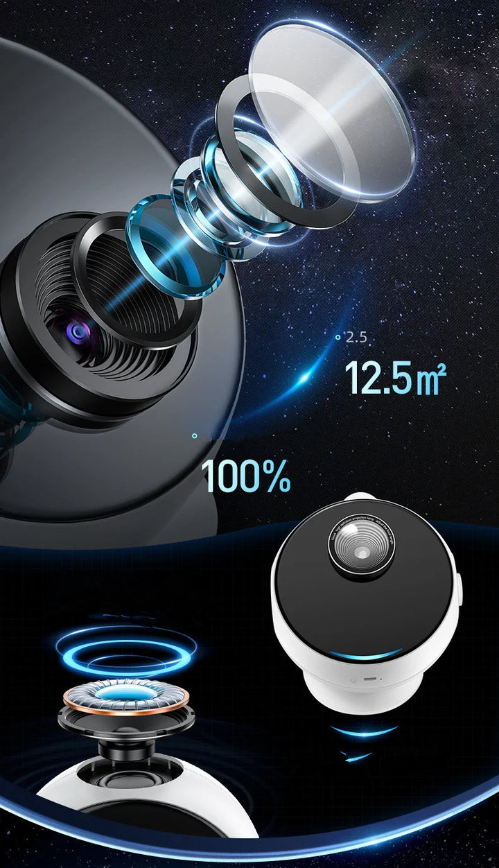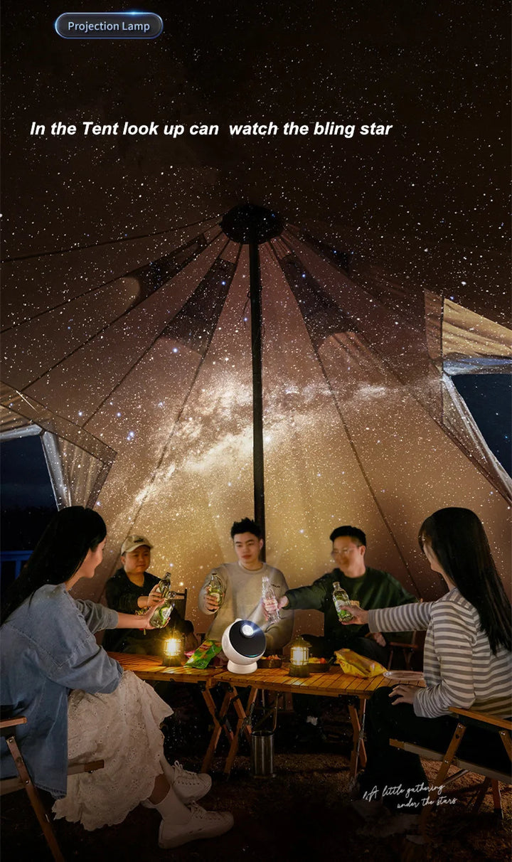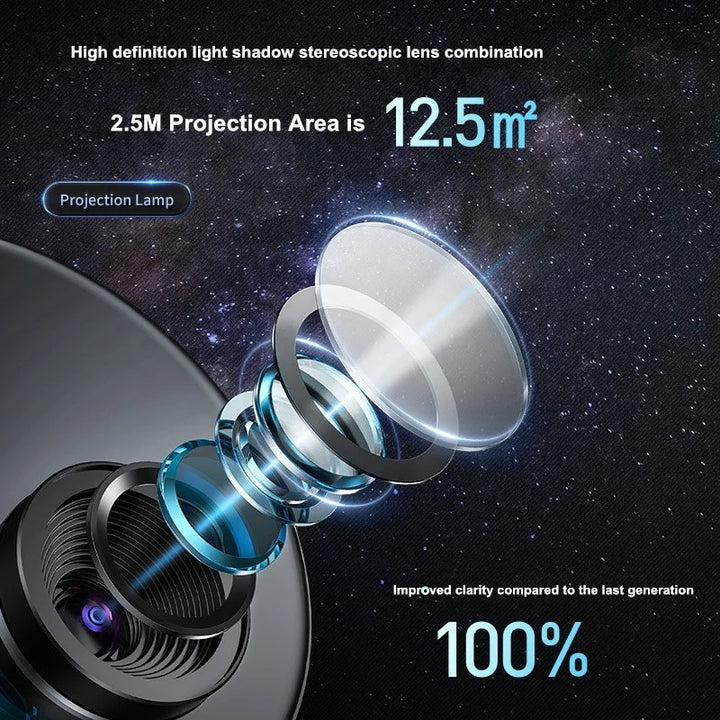 Enjoy new upgraded HD projection with the ability to fine-tune the focus, achieving clear imaging. The projector supports up to 5M projection distance and a 70㎡ projection area. The 360° rotatable scene projects on the ceiling, walls, and floors. -