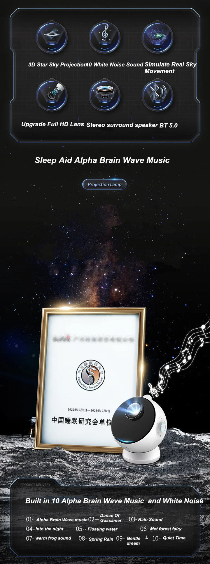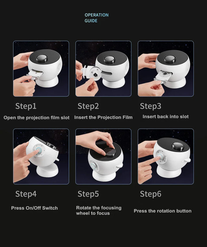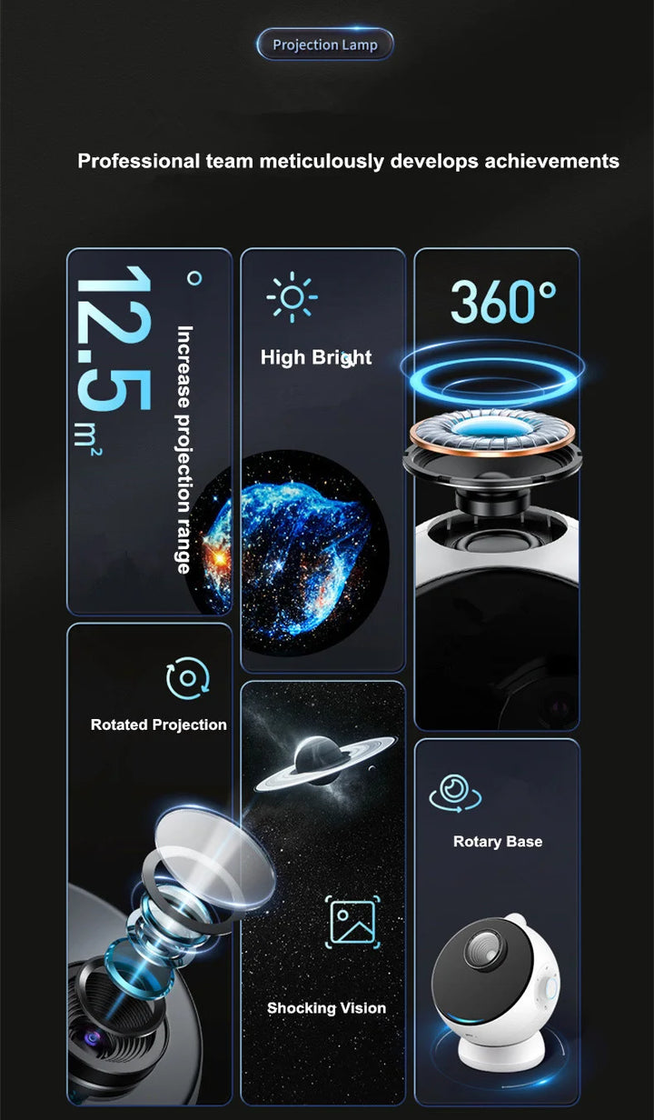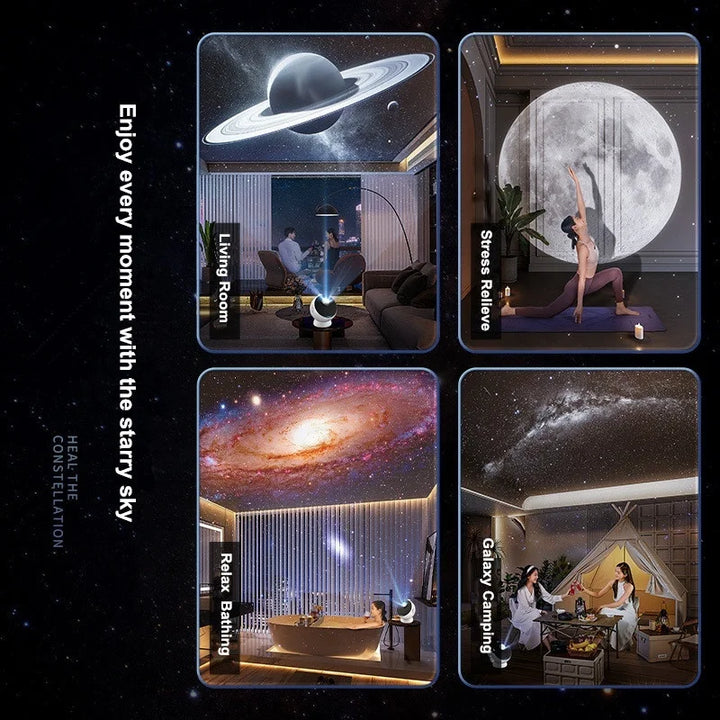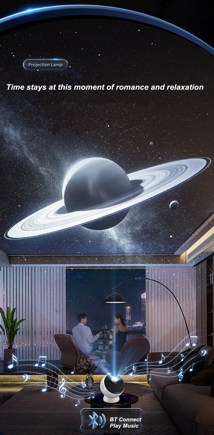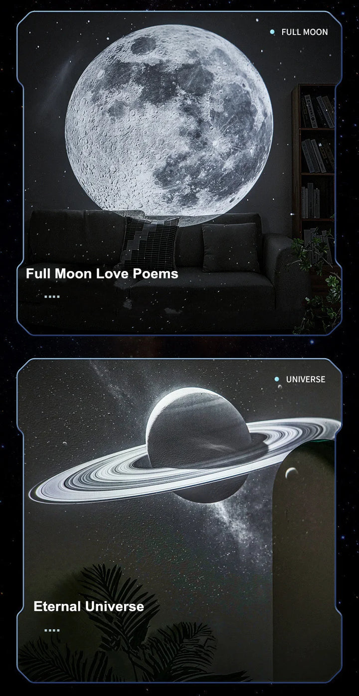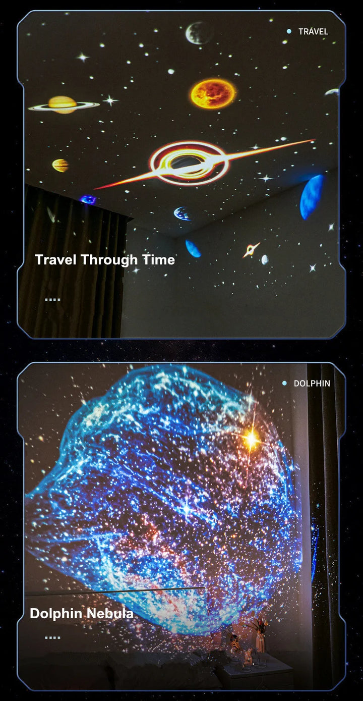 Comes with 6 display scenarios: Galaxy, Saturn, Andromeda, Dolphin Nebula, Bright Moon in the Sky, and Through the Black Hole. Immerse yourself in the universe, right in your room. -