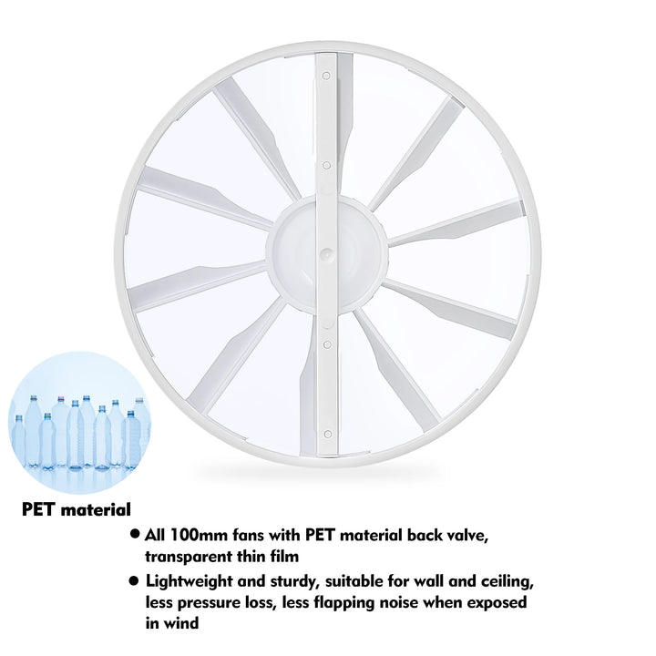 All fans are equipped with a PET material backdraft valve (similar to water bottle material), made from clear thin film.
