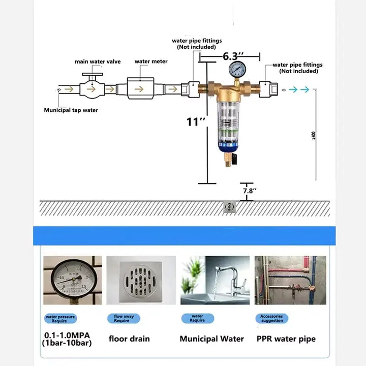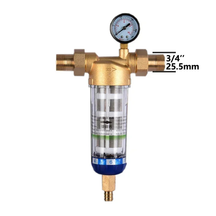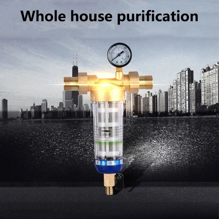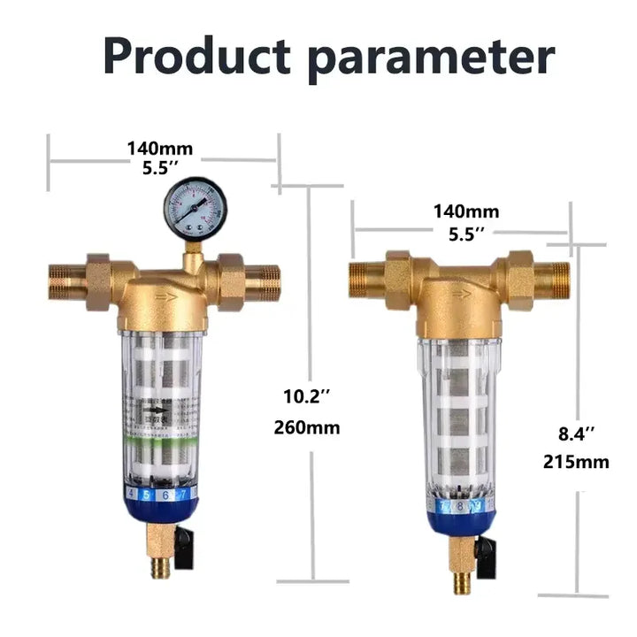 Equipped with a built-in water pressure gauge, this prefilter monitors real-time water pressure at all times. Family members can take necessary measures to address abnormal water pressure, ensuring the safety of your water supply. The general household water pressure range is 0.1MPA-1MPA.