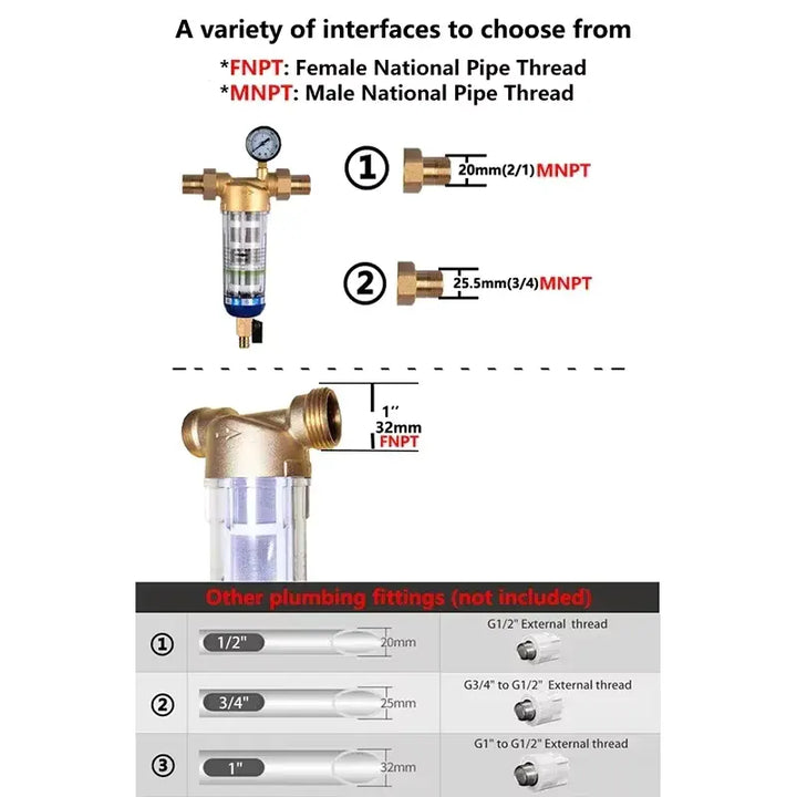 This prefilter comes with 1'', 1/2'', and 3/4'' Male MNPT connections. It is suitable for any pipe, with customers needing only to purchase the corresponding adapter (the threaded adapter is not included in the package and needs to be bought separately, based on the specifications of the copper/PEX/CPVC water pipe). Installation will not affect your existing water pressure levels.